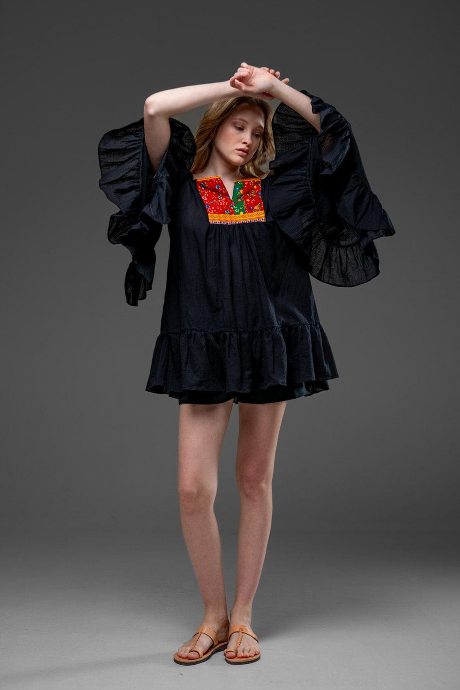 Black Cotton Bell Sleeve Bohemian Camisa Short Dress