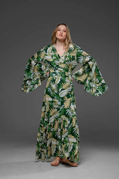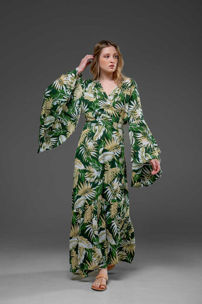 This green leaf pattern hippie elegant,boho-spirited dress, is