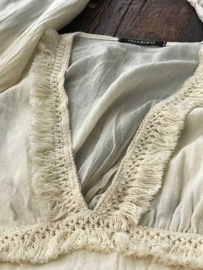 A beautiful 100% organic cotton bohemian long dress featuring long bell sleeves and a V neckline with cotton fringes.