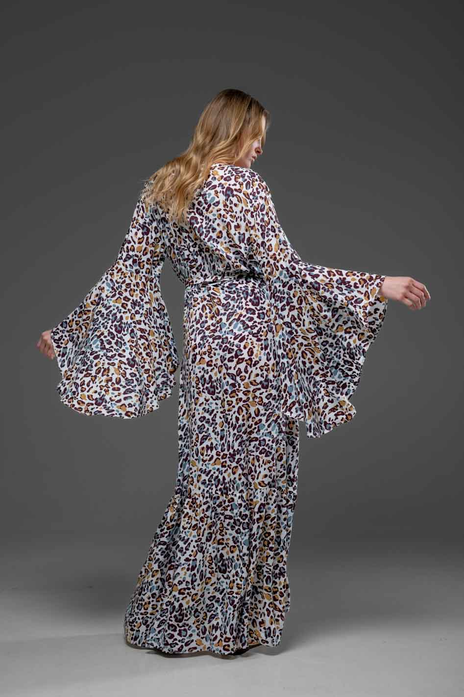 A bohemian gypsy maxi dress, decorated with leopard patterns.