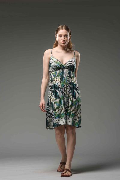 Jersey jungle printed spaghetti strap, elastic under the bust, short dress.