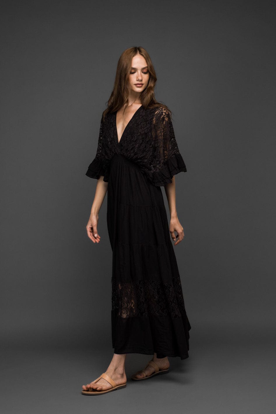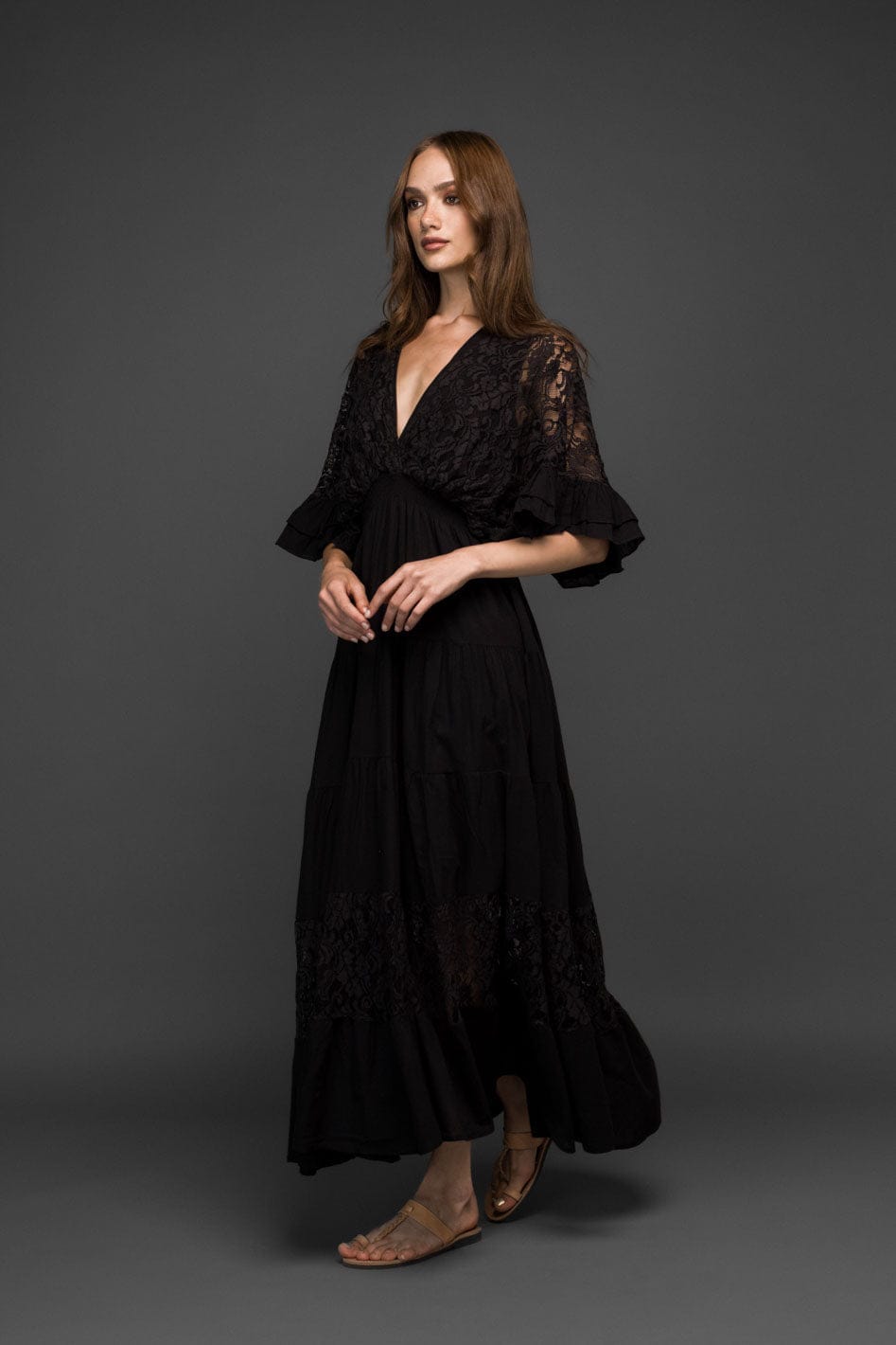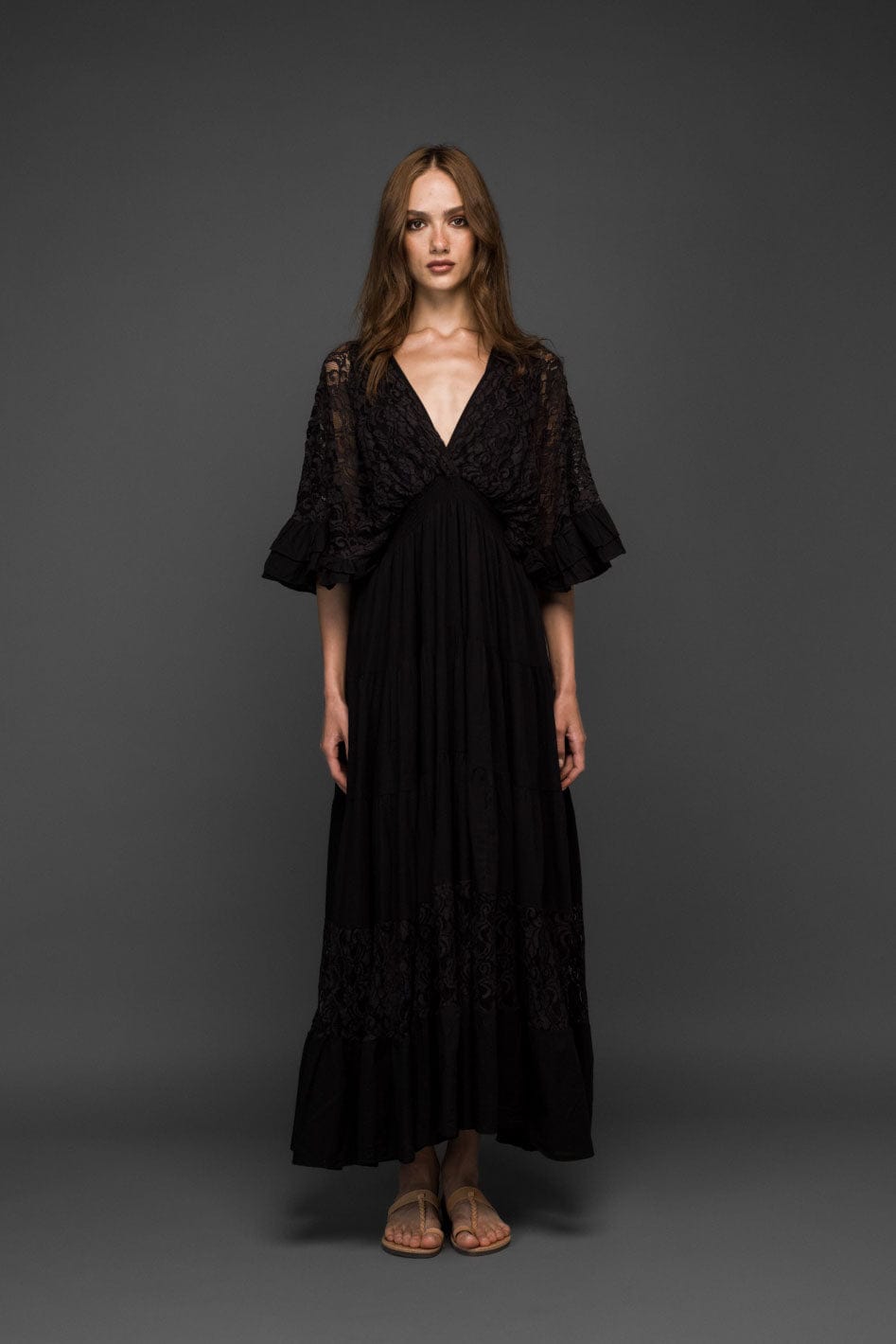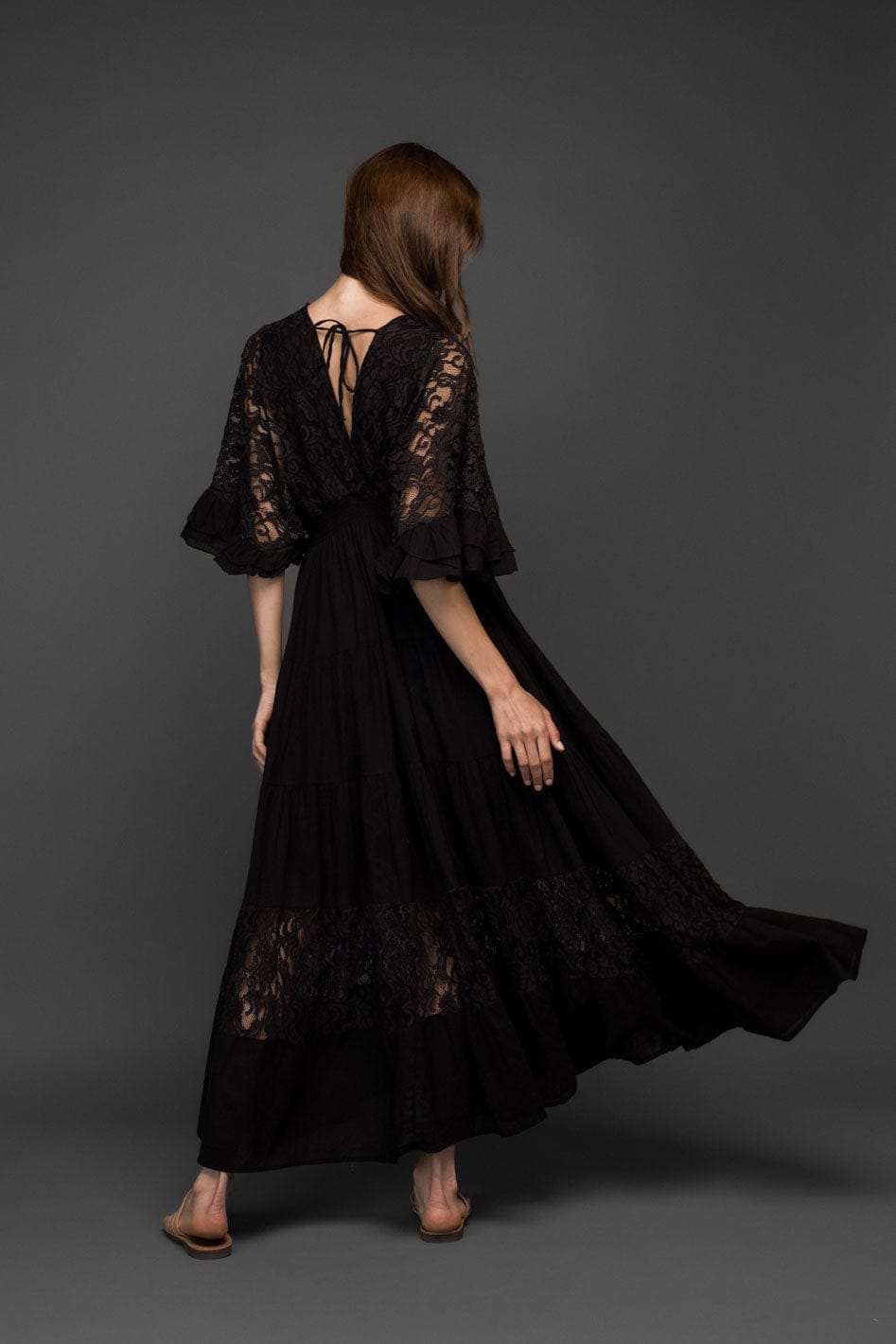 Flowy and elegant, this black cotton maxi dress features delicate lace panels, a deep V neckline and softly flared sleeves with ruffle cuffs. The airy skirt moves beautifully while the lace adds a romantic boho touch. Adjustable back tie detail offers a flattering fit.