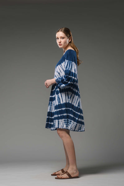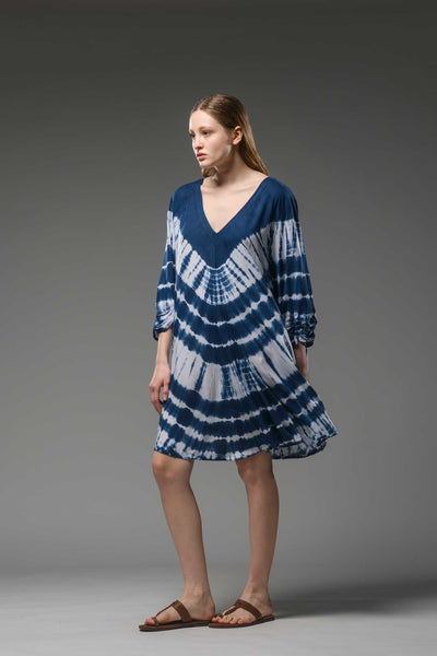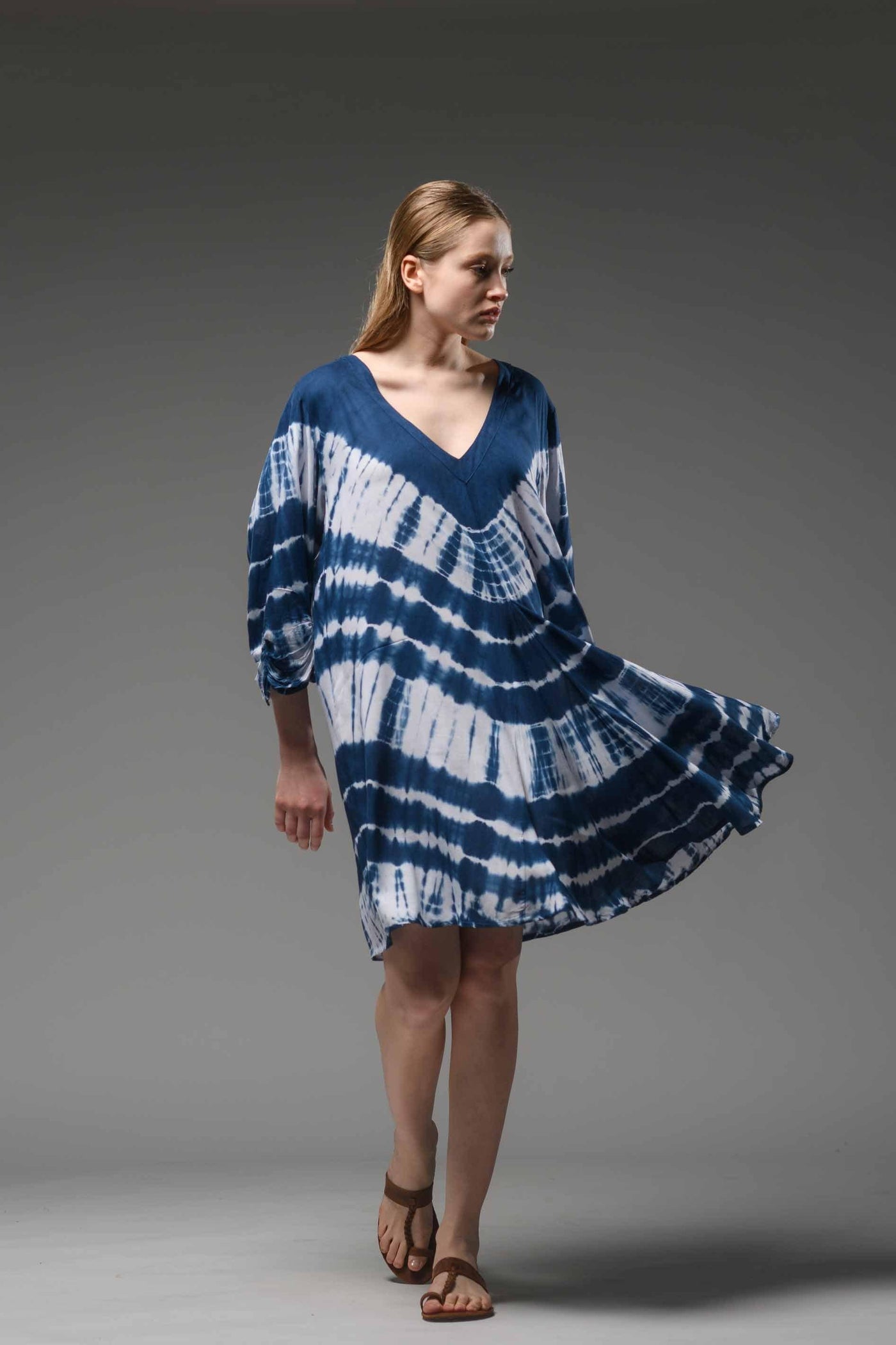Easy wear blue white tie dye V neck 3/4 sleeve midi dress.