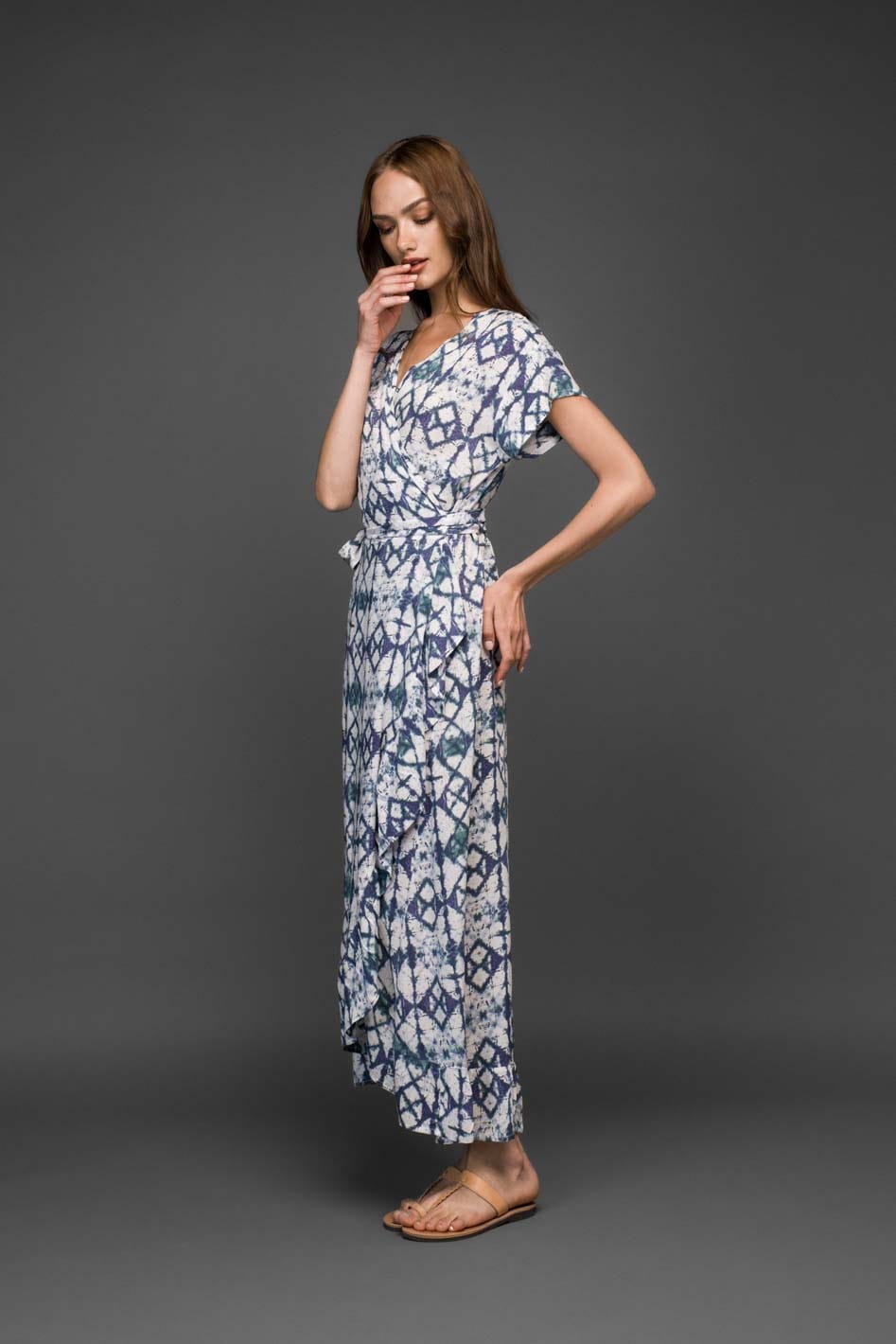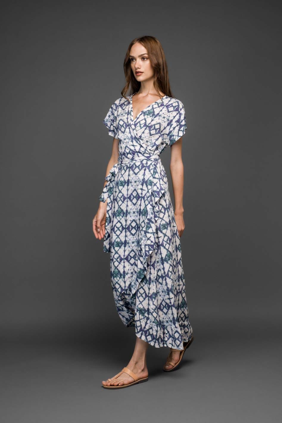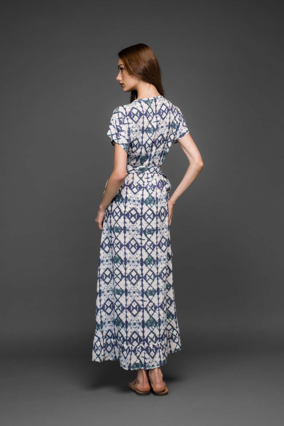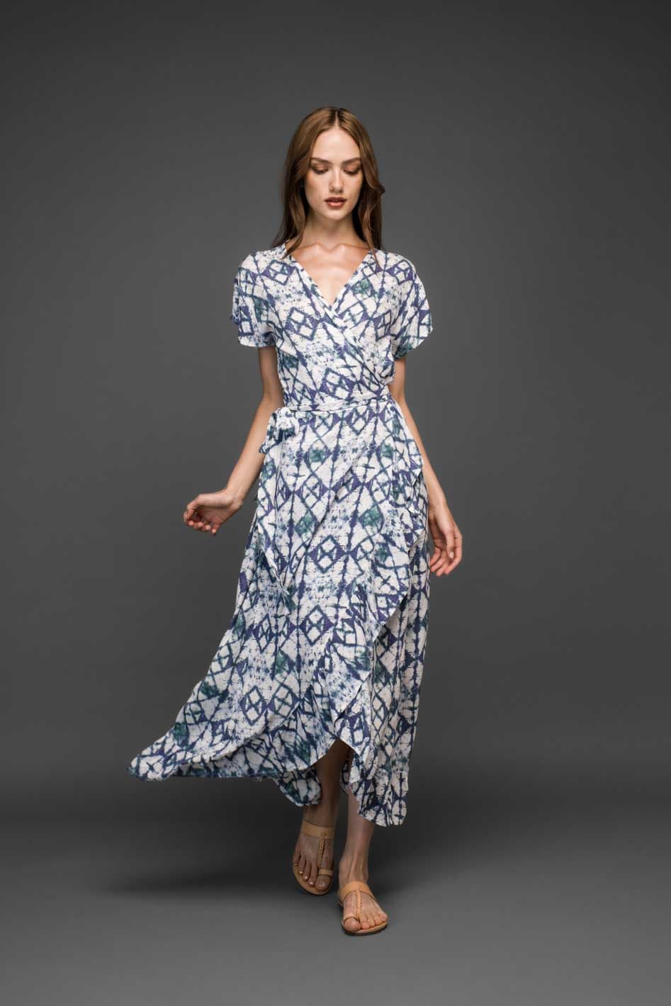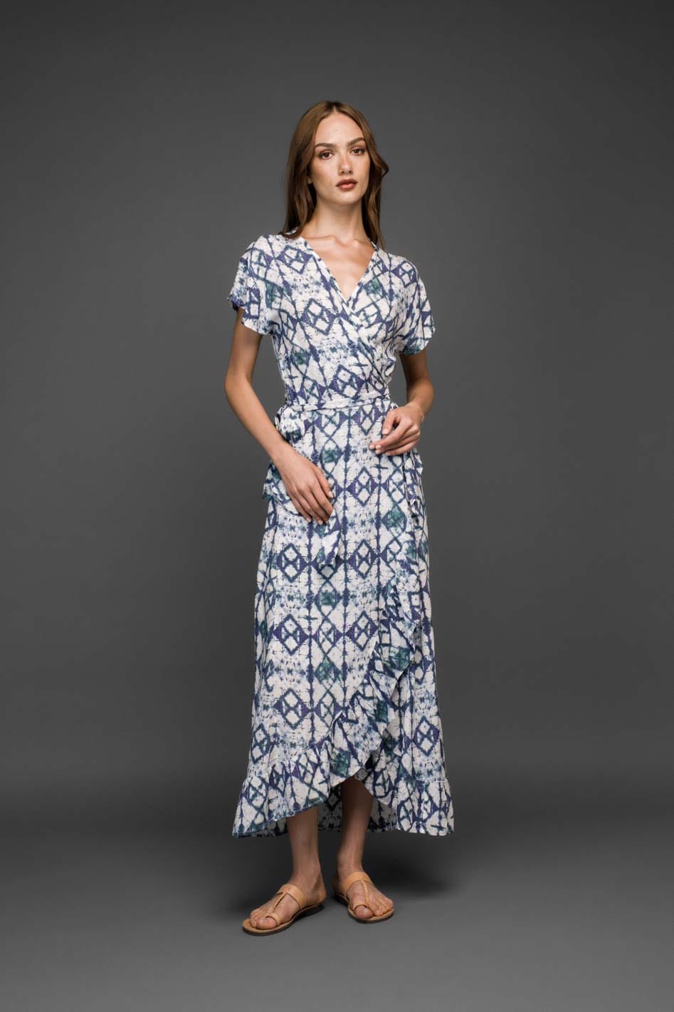 Ένα κομψό μπλε wrap φόρεμα με εντυπωσιακό μοτίβο, σχεδιασμένο για ζεστές καλοκαιρινές ημέρες και χαλαρές βραδινές εμφανίσεις.