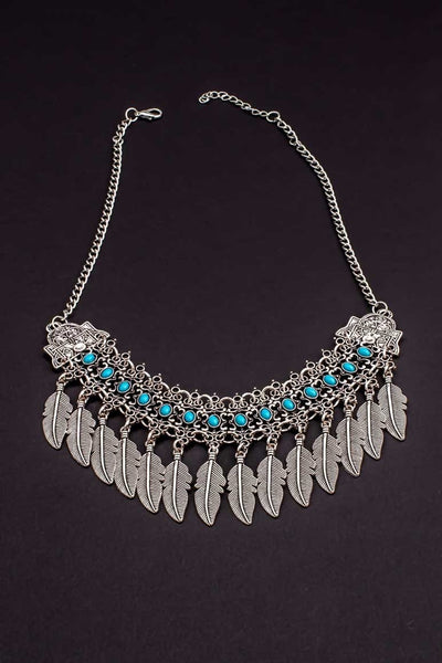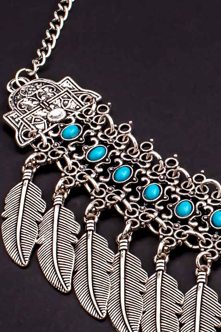 Μποέμ μεταλλικό κολιέ διακοσμημένο με τυρκουάζ πέτρες και μικρά φτερά.
