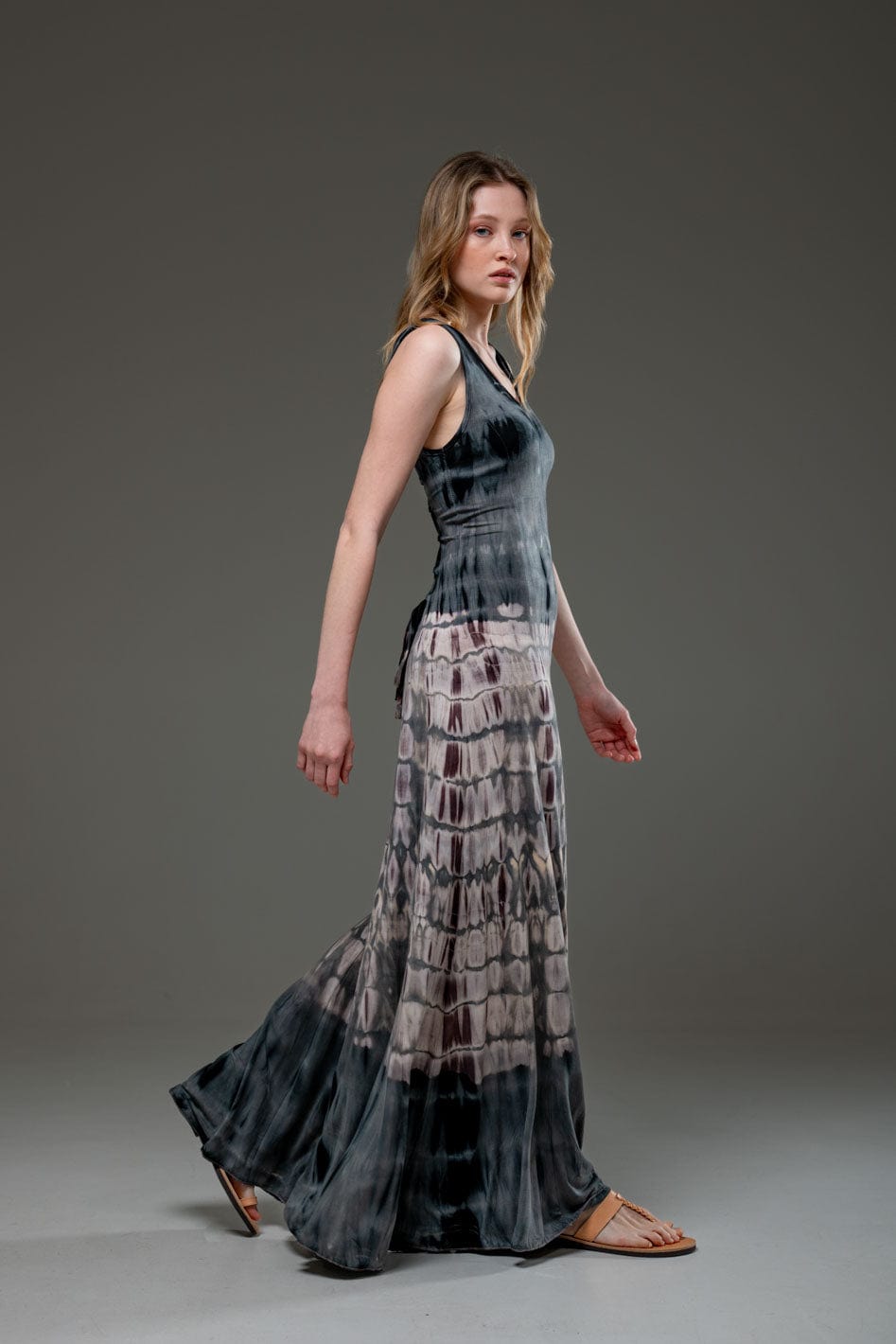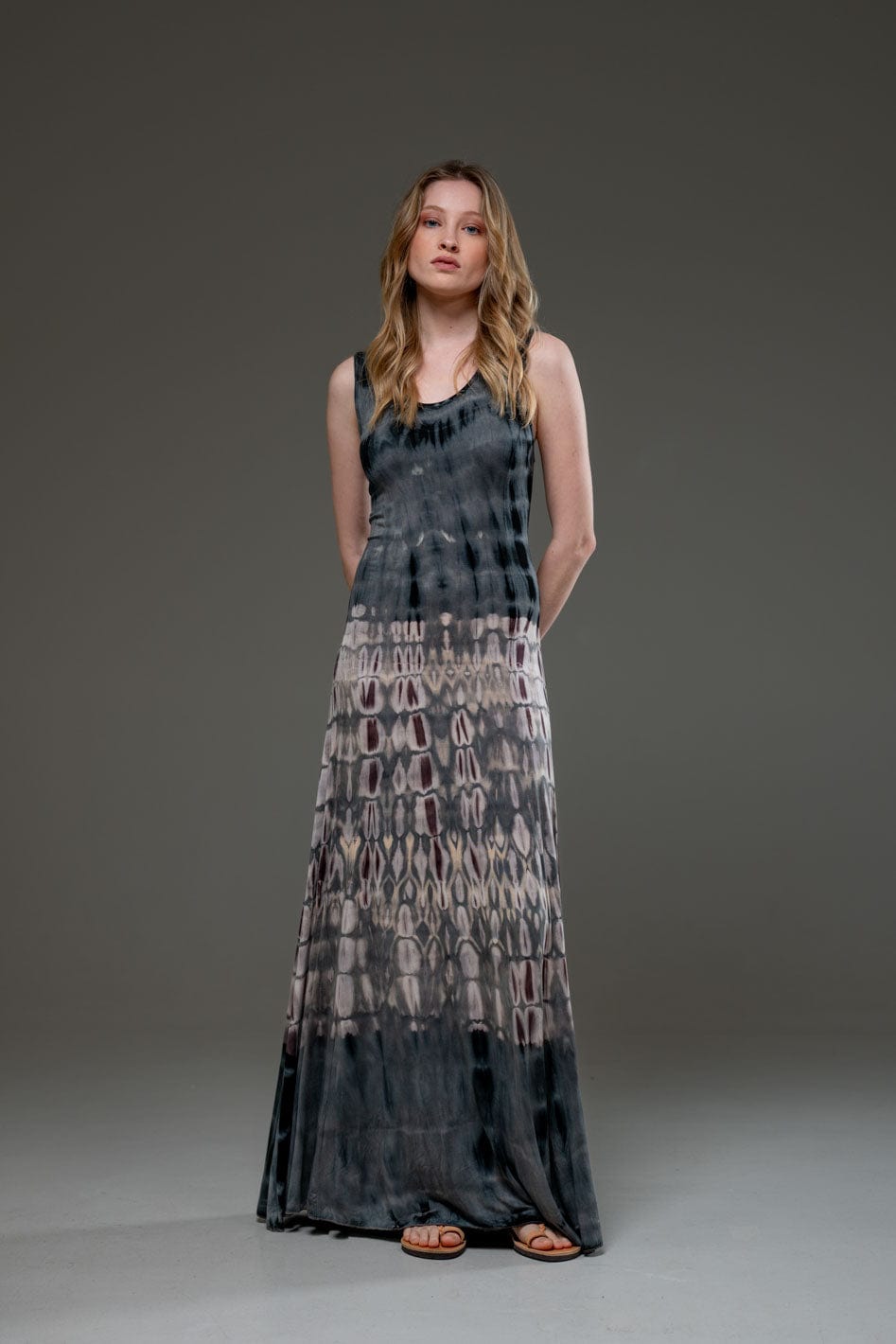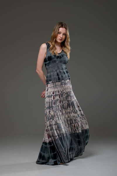 Tie Dye Jersey Elastic Fabric Low Back Scoop Neckline A Line Long Dress