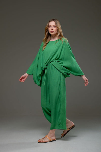 Green Rayon Crepe Full Length elegant pants and fowing batwings Blouse Set